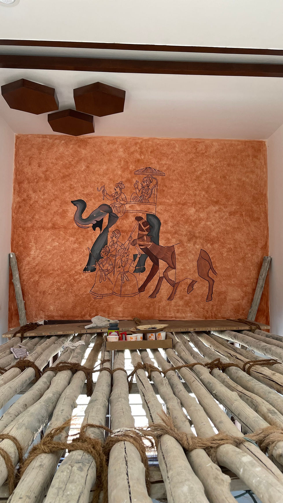 Inspired by the grandeur and opulence of Rajasthani culture, this mural seeks to transport viewers to an era of royal processions and grand parades. The use of natural brown tones symbolizes Rajasthan's rich heritage and traditional essence, offering a visually captivating and historically immersive experience.