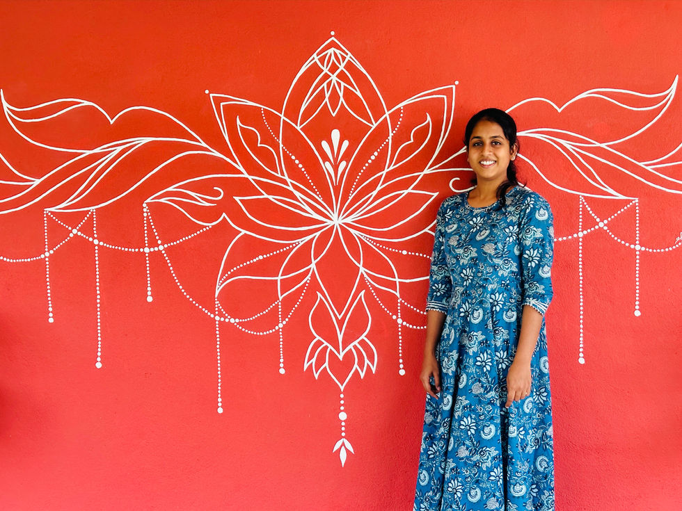 Hand-Painting: Executing the final mural on the wall with meticulous attention to detail, ensuring the lotus flower and mandala patterns were perfectly rendered.